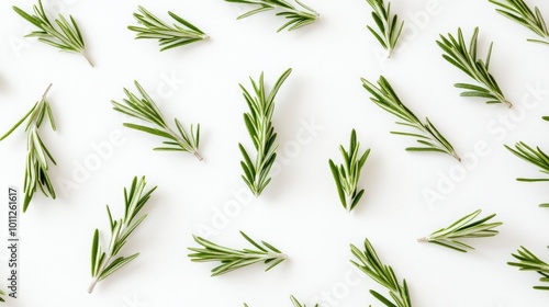 Fototapeta premium Fresh rosemary leaves spread across a white background, offering a natural...