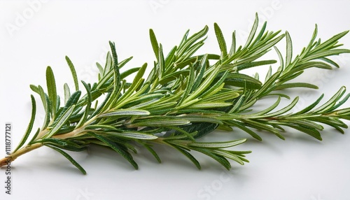 Fototapeta premium Fresh rosemary sprig on white background. Aromatic herb, culinary and medicinal uses.