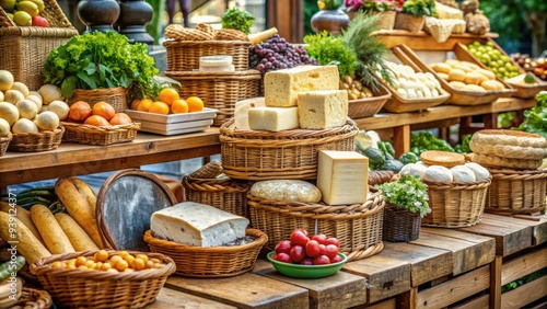 Fototapeta premium Fresh seasonal produce, artisanal cheeses, and crusty breads on display at a bustling organic market, surrounded by woven baskets and vintage wooden crates.