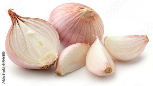 © AnotharS, Obraz premium Fresh shallots arranged artistically on a white background.