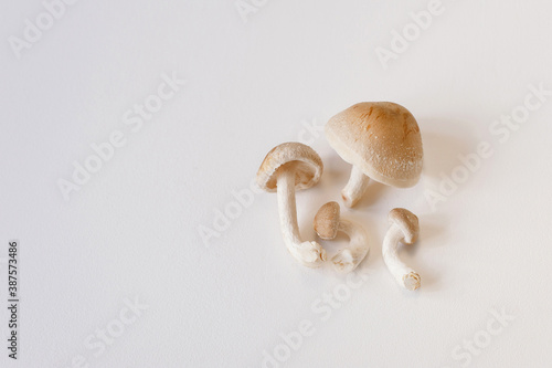 Fototapeta premium Fresh shiitake mushrooms lie on a white background. Top view close up with copy space.