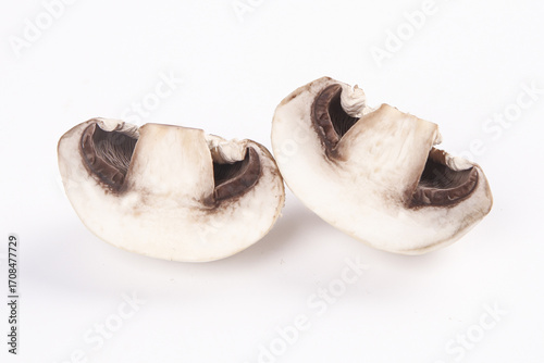 © PhamThi, Fototapeta premium Fresh Sliced Mushrooms on White Background Studio Photography