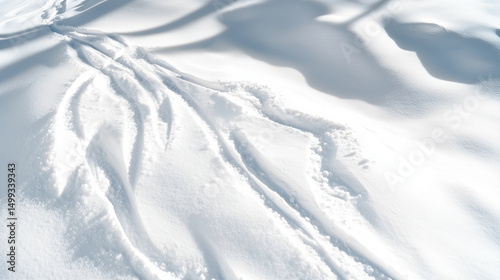 © Thailand Smile, Fototapeta premium Fresh snow covers ground, showcasing intricate patterns and trails left by movement, creating serene winter landscape