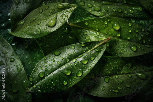 Fototapeta premium Fresh spices leaves background, adorned with glistening droplets of water....