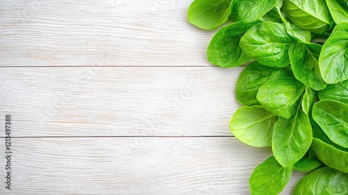 © Giman, Fototapeta premium Fresh spinach leaves on white wooden background; healthy eating concept