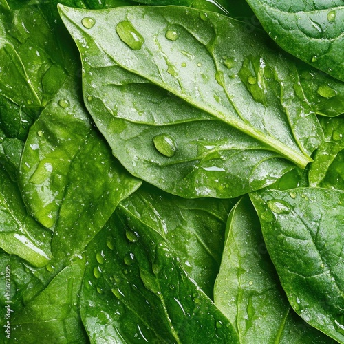 © Ibnu, Fototapeta premium Fresh spinach leaves, wet with water droplets