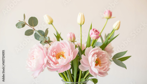 Fototapeta premium Fresh Spring Flowers: Peonies, Tulips, and Eucalyptus