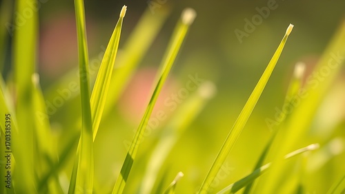 Fototapeta premium Fresh spring grass blades highlighted by sunlight with a soft, blurred effect.