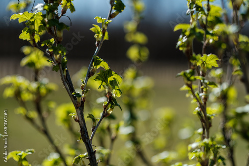 Fototapeta premium fresh spring leaves on bushes and trees with blooming flowers