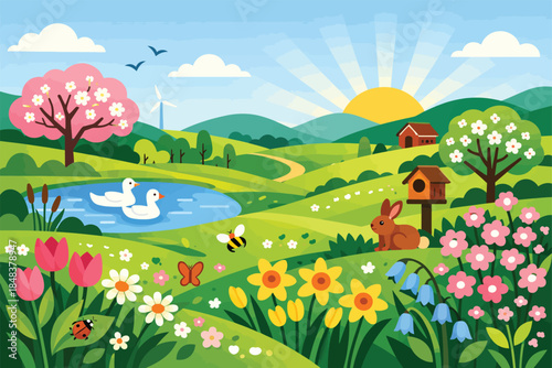 © MORIUM JANNAT, Fototapeta premium Fresh Spring Season Illustration With Blooming Flowers Green Leaves Soft Nature Growth And Renewal Concept