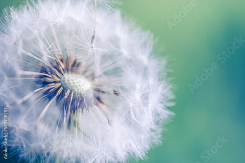 Fototapeta premium Fresh spring white dandelion flower with seeds in springtime in blue turquoise abstract backgrounds. Artistic nature closeup, bright sunny blurred foliage lush. Relaxing tranquil macro, natural plant