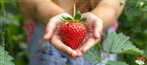 © Andrei, Obraz premium Fresh strawberry held by child with blurred background for text, copy space available