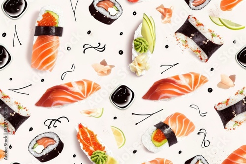 Naklejka premium Fresh sushi and ripe avocado on a clean white surface, perfect for food...