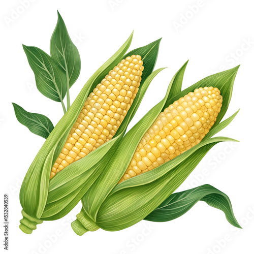 © Muhammad, Obraz premium "Fresh Sweet Corn Ears with Green Husks on Transparent Background"