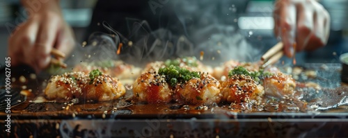 © Dalibor, Obraz premium Fresh takoyaki balls being prepared on a hot plate, topped with green onions. Free copy space for banner.