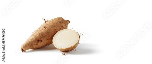 © AbstractAI, Fototapeta premium Fresh taro roots (colocasia) and a sliced piece displayed on a white background