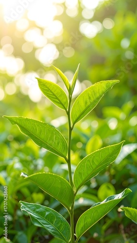 © Istirokah, Fototapeta premium Fresh tea leaves in sunlight