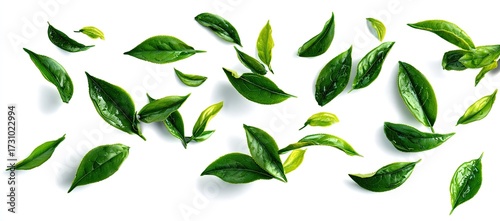 © Siraman, Naklejka premium Fresh tea leaves scattered on a white background