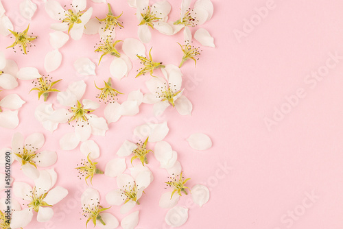 Fototapeta premium Fresh tender summer flowers background with white petals and buds of apple tree flowers on pastel pink background as border, copy space for text, top view. Romantic floral background in modern style.
