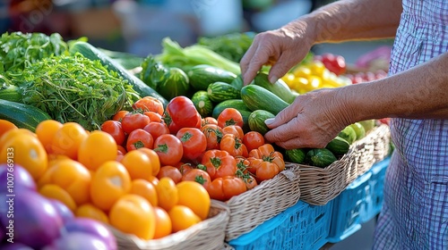Fototapeta premium Fresh Tomatoes Cucumbers and Greens at Farmers Market