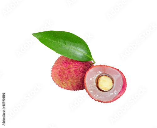 © Topfotolia, Obraz premium fresh two red lychee sweet fruit open peel and cut half show seed green leaf. Isolated on white background with clipping path