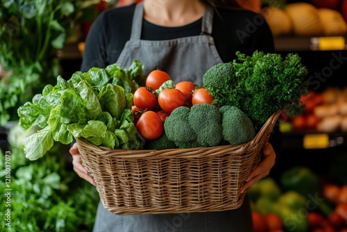 © itchaznong, Fototapeta premium Fresh vegetable harvest a bountiful basket of greens grocery store food photography indoor close-up