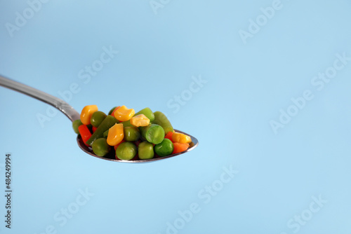 © New Africa, Fototapeta premium Fresh vegetables in spoon on light blue background. Space for text