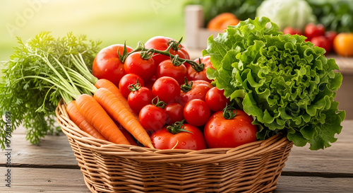 © malaika@86, Fototapeta premium Fresh Vegetables in Wicker Basket on Wooden Table | Healthy Eating and Local Produce for Food Blog, Recipe Illustration, and Organic Market Advertising
