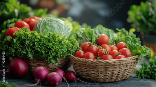 Fototapeta premium Fresh vegetables in woven baskets, including tomatoes, lettuce, and cabbage,...