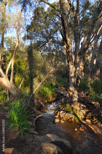 Obraz premium Fresh water creek and eucalyptus trees, Whistlepipe Gully Walk, Mundy Regional Park, Kalamunda, Western Australia, Australia