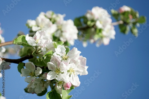 © ayuk1, Obraz premium Fresh white and pink apple blossoms blooming on a branch in the
