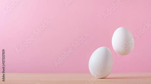 Fototapeta premium Fresh white eggs on pastel pink background, creating serene atmosphere