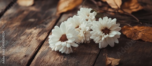 Fototapeta premium Fresh White Flowers with Brown Leaves on Rustic Wooden Table Surface