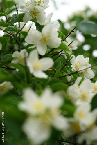 Obraz premium Fresh white jasmine flowers after rain in garden