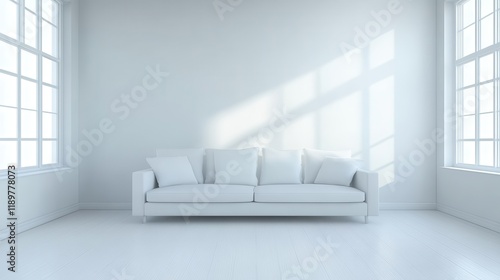 Fototapeta premium Fresh white living room with clean lines, cozy furnishings, and a minimalist...