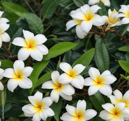 © Sayfar, Naklejka premium Fresh white plumeria flowers with green leaves background, plumeria, flora, nature, fresh, white