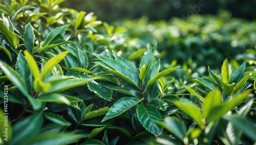 © Giovanni, Fototapeta premium Fresh young green tea leaves in a field on a sunny summer morning
