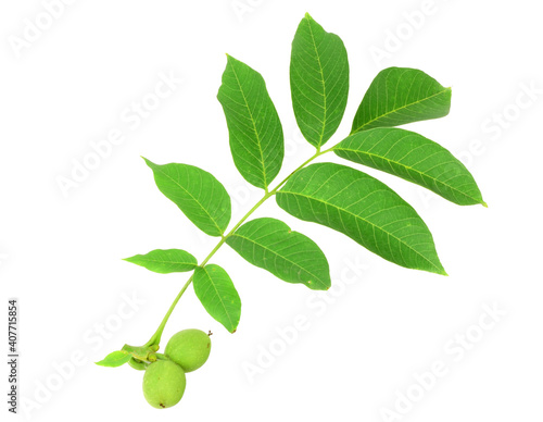© Gummy Bear, Fototapeta premium Fresh Young Unripe Walnut Drupe on the Branch for Medicinal Use or Liqueur. Isolated on White Background.