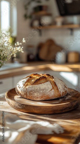 © Photo_hub, Naklejka premium Freshly baked artisan bread on wooden plate in rustic kitchen