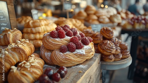 Fototapeta premium Freshly baked pastries displayed in a cozy bakery with customers enjoying their treats