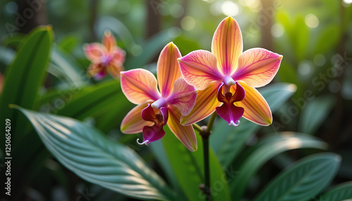Fototapeta premium Freshly bloomed orchids in a tropical jungle setting