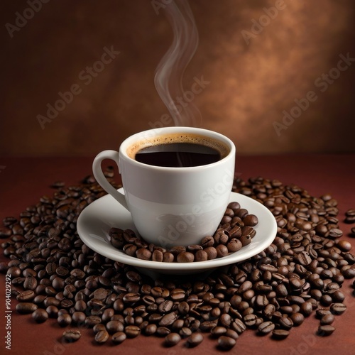 Obraz premium Freshly brewed coffee cup surrounded by aromatic coffee beans.