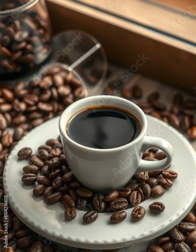 Fototapeta premium Freshly brewed coffee served in a white cup surrounded by roasted coffee...