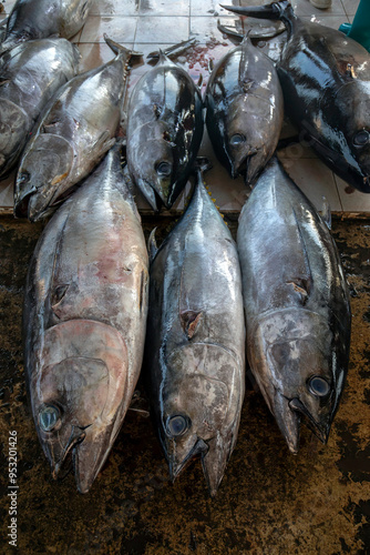 © Thomas, Fototapeta premium Freshly caught yellow fin tuna for sale at the Negombo Fish Market on the west coast of Sri Lanka in the early morning.