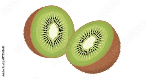 © Lukyzawa, Obraz premium Freshly cut kiwi fruit halves, showcasing vibrant green flesh and seeds.