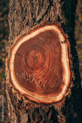 Fototapeta premium Freshly cut tree cross-section with heartwood growth rings