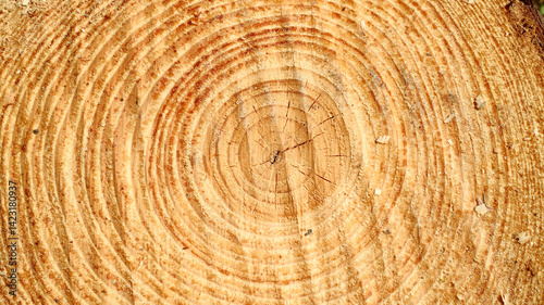 Naklejka premium freshly cut tree trunk cross section showing detailed concentric growth rings, wood grain pattern and texture backgdrop