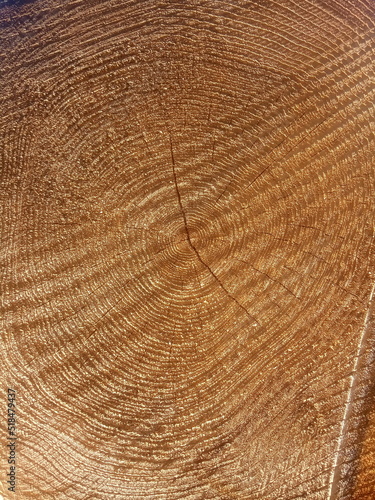 © kukuruzik, Fototapeta premium Freshly cut tree with annual rings. Close-up of round logs. The texture of a fresh sawn wood