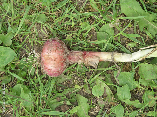 © Иван Ульяновский, Obraz premium Freshly dug organic red onion drying on the grass in sunny day