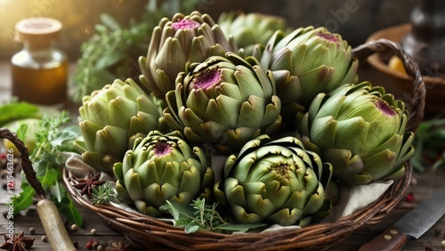 Fototapeta premium Freshly harvested artichokes displayed in a rustic basket on a wooden table
